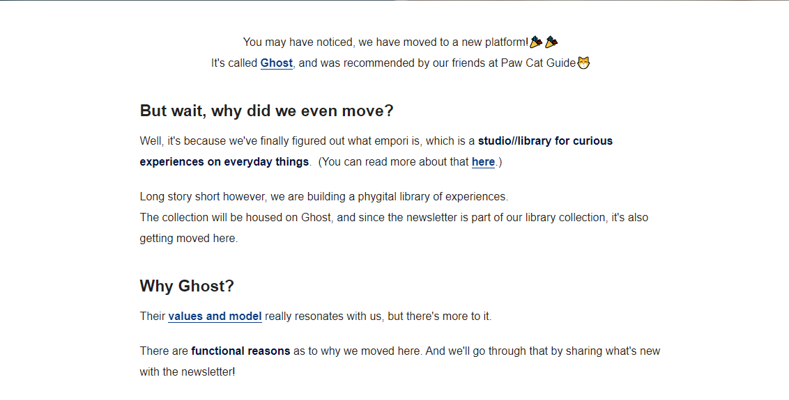 As we embark on a new round of hiatus to upgrading the empori library, we thought we'd also look back at a big move we made, migrating both our website and newsletter onto Ghost.