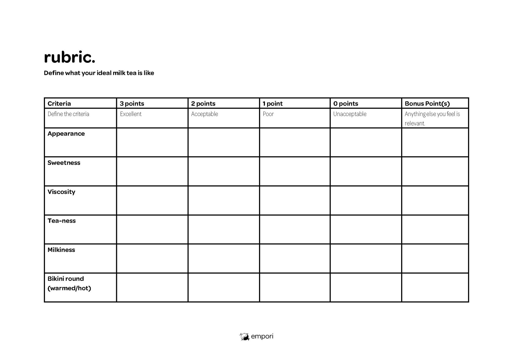 Think about what you like about it in terms of its flavor, the packaging (if applicable). Use these factors to help come up with your own rubrics for what factors an ideal milk tea should have.
