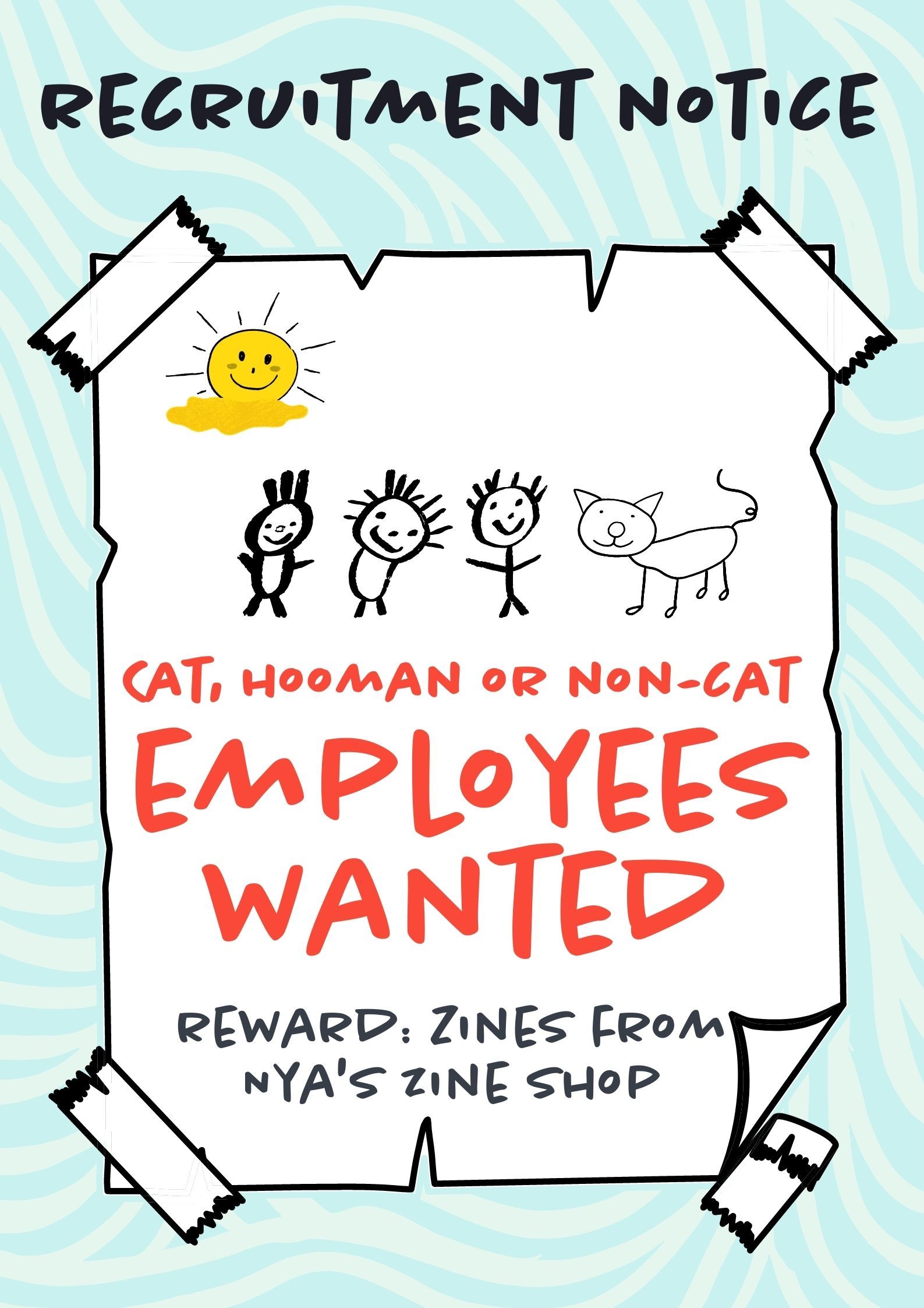 This PARK(ing) Day, Nya's Zine Shop is setting up a pop-up store to recruit new Hooman Employees! And you, potential participant and future employee, will get free zines as part of your onboarding process!